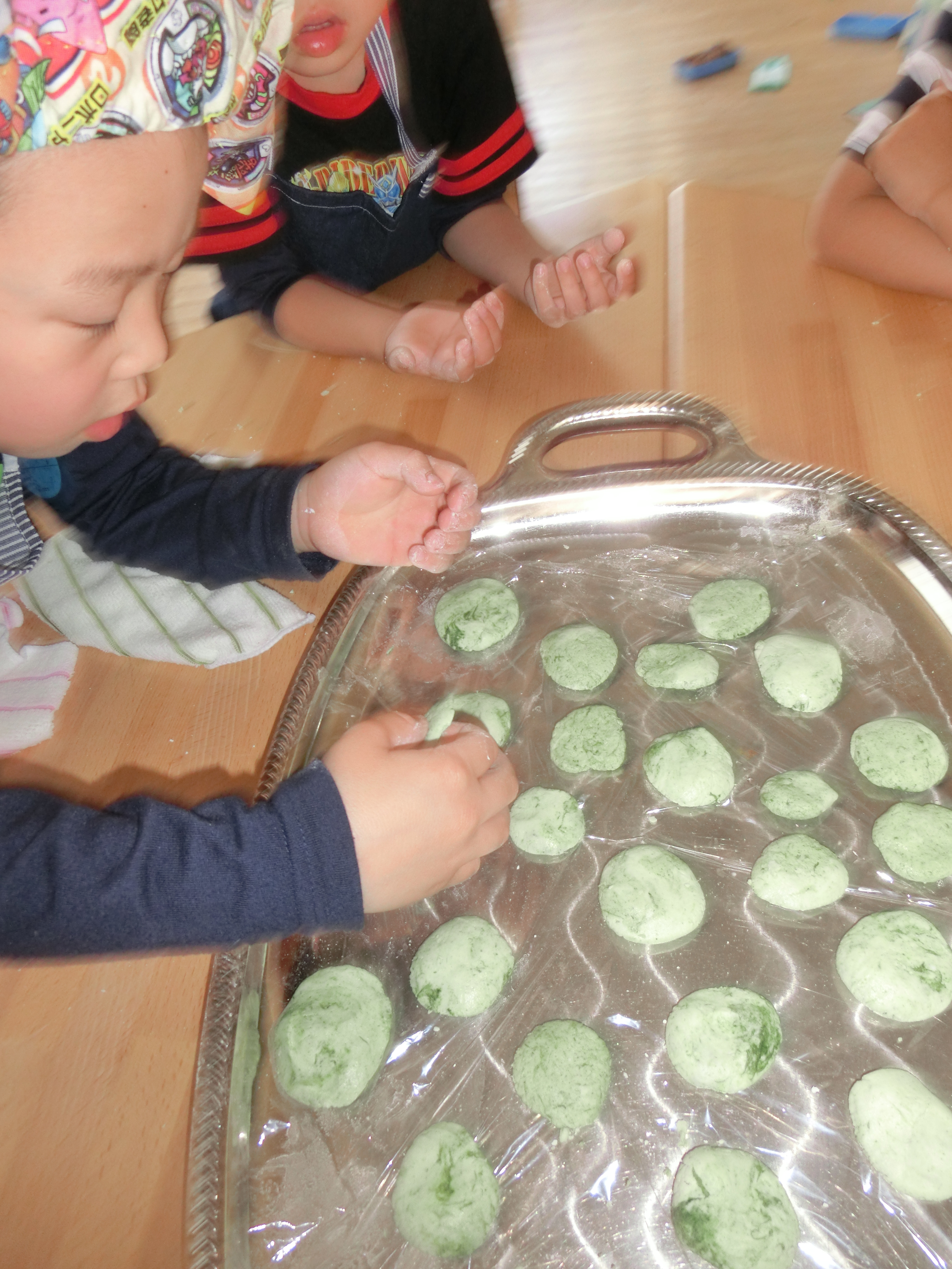 摘んだよもぎを園に帰って、茹でて、すり鉢でつぶし、白玉粉に混ぜて茹でます。黄な粉をまぶしておいしいよもぎだんごの出来上がり!! 木いちごはジャムにしてクラッカーにつけて味わいました。恵みに感謝!!